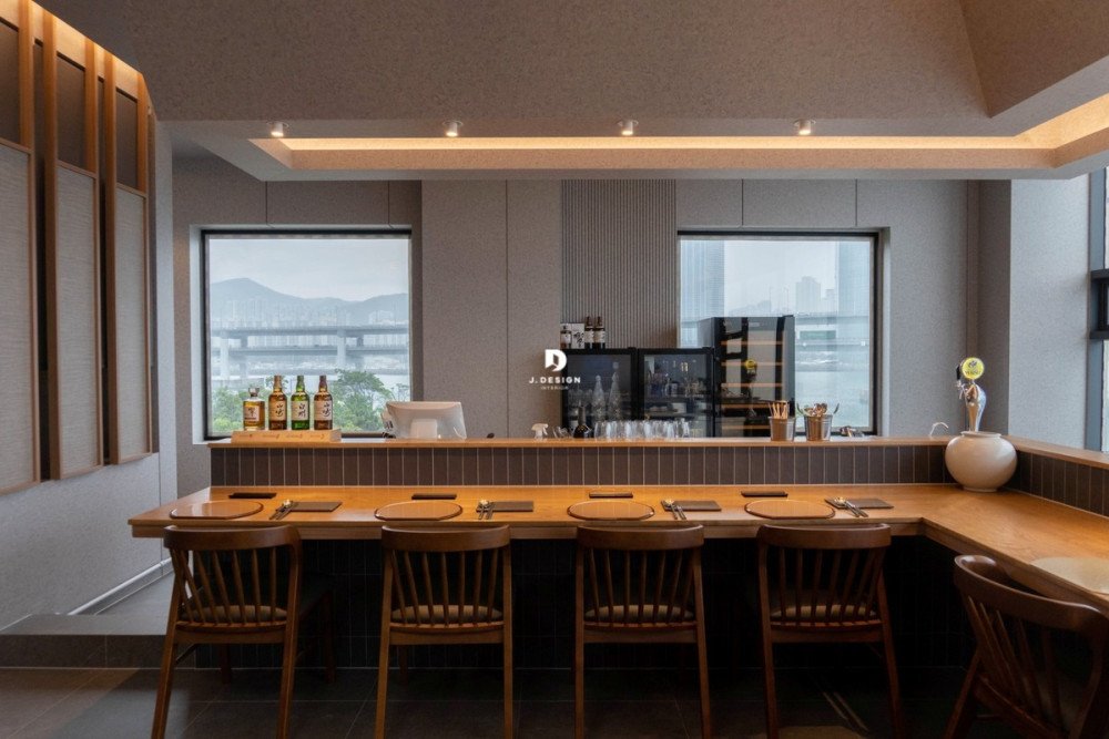 프리미엄 양고기 오마카세 인테리어로 업종의 아이덴티티를 살려 고급스럽게 완성한 부산인테리어 다찌형 테이블을 설치해 요리하는 셰프와 방문객들이 동선 구애 받지않고 음식에 집중할 수 있도록 했습니다.