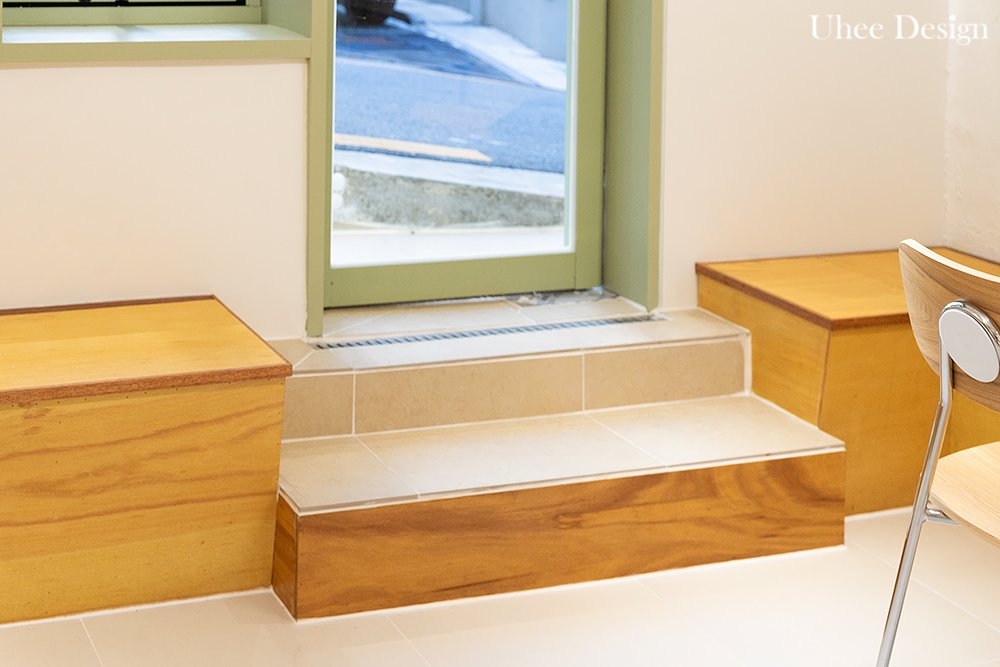 앞에 놓인 우드 벤치는 지나가는 사람들이 자연스럽게 머물도록 유도합니다.