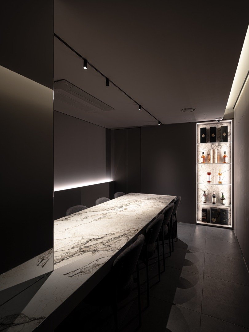 There are invisible exchanges that exist between people, and between people and objects. Yeo Baek is a space designed to embrace not only seasonal cuisine but also the diverse cultures, stories, and artworks shared among people. It embodies the hope that, as the empty space becomes filled, new connections are formed. Upon entering, visitors are first greeted by a floating gallery wall that conceals the counter area from direct view. The wall acts as a soft boundary: the outer corridor, finished in subtle gray tones, contrasts with the inner hall, which is bright and open. This creates a stage-like setting where the chef’s movements and dishes can be appreciated as both performance and art. To emphasize the chef and his creations, the art wall is intentionally left bare, while the hearth faces the guests directly, forming the visual centerpiece of the space. The circulation leading to the kitchen is discreetly hidden behind the art wall, continuing the concept of Yeo Baek — the beauty of emptiness and restraint. Behind a partition lies a private dining room, accessible only to reserved guests, its entrance concealed by a hidden door to evoke intimacy and exclusivity. The dark-toned interior is accented with a marble countertop and softly lit display shelves, while mirrored columns are used to amplify the sense of depth and spatial illusion within the low, narrow space. |