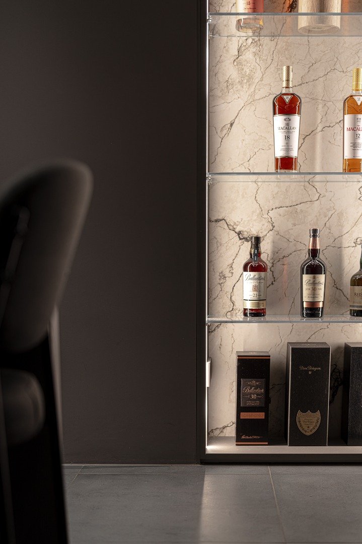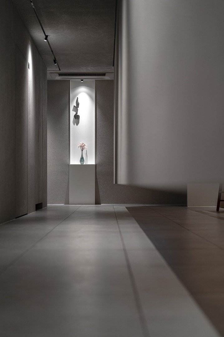 Construction Finished, 2023 위치 : 서울시 강남구 청담동 용도 : 일반음식점 면적 : 115㎡ (35py) 팀원 : 최빈, 최한중 사진 : 제리그래퍼 동영상 : https://youtu.be/b1RkUvvYCN8?si=KkjtGWQTwX5KUJQz 사람과 사람, 사람과 사물 사이에는 보이지 않는 교감들이 존재한다. 청담 여백은 계절에 따른 음식뿐만 아니라 사람들 사이의 다양한 문화와 이야기, 작품들을 담을 수 있는 공간으로, 여백의 공간이 채워지며 서로 연결되고자 하는 바람이 담겨 있다. 먼저, 입구에 들어서면 카운터석이 바로 보이지 않도록 떠있는 갤러리 벽을 거치도록 했다. 벽을 경계로 바깥쪽 그레이톤의 갤러리 복도와 대비되도록 안쪽에는 밝은 홀을 두어 셰프가 요리하는 모습과 음식을 무대 위 공연과 작품처럼 느껴지도록 연출했다. 셰프와 작품이 부각될 수 있도록 아트월을 비우고 화로의 전면이 고객쪽을 바라보도록 위치시켰다. 또한 주방으로 이어지는 동선은 자연스럽게 아트월 뒤로 숨겨서 여백의 컨셉을 이어 나갔다. 가벽 뒤로 숨겨진 프라이빗룸은 예약 고객만 경험할 수 있는 아지트공간으로 히든도어를 사용하여 더욱 내밀한 느낌을 주었다. 어두운 바탕에 대리석상판과 장식장을 조명으로 강조하고, 좁고 나지막한 공간에 거울기둥을 두어 확장과 착시효과를 적극 활용하였다.