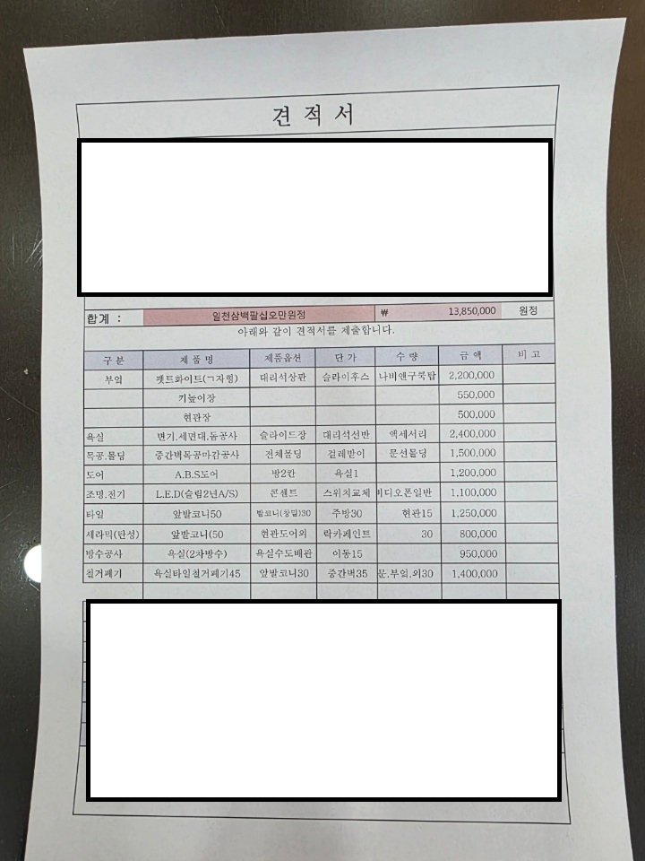 단가와 수량에 다른 내용들이 적혀있고 세부내역이 없이 이런 견적서는 그냥 사기당하기 좋은 견적서 일뿐입니다.