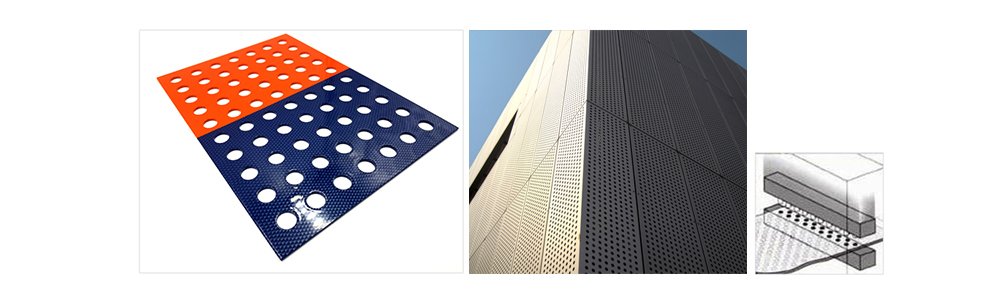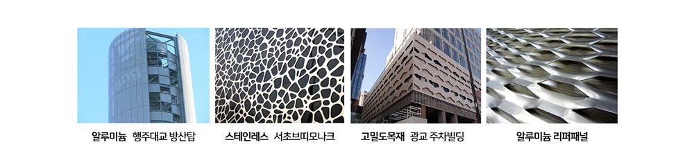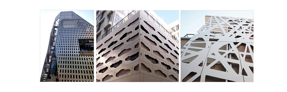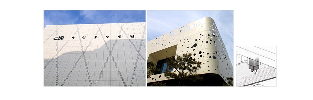 타공판, 유공판, 펀칭판 등 다양한 이름으로 불리고 있습니다. 일반 외장재와 다르게 타공패턴 사이로 빛이 투과하며 아름다운 야경을 만들어내거나