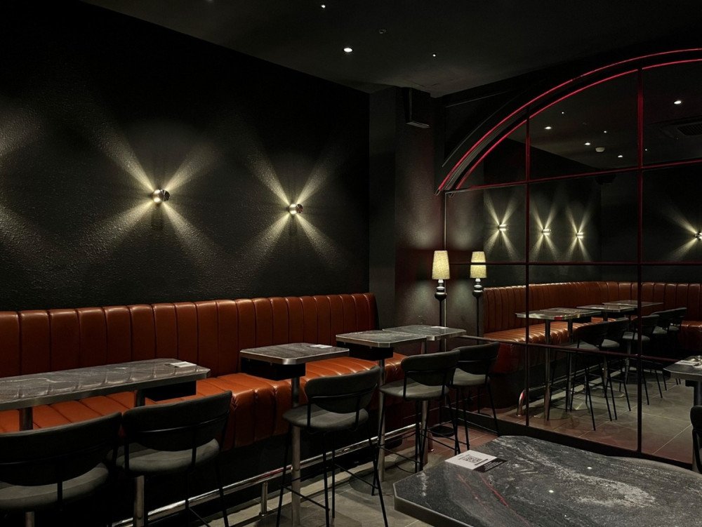 주요 마감재는 거친 질감의 스톤 텍스처와 짙은 톤의 우드를 대비시켜 세련된 입체감을 극대화했습니다. 특히 바 카운터 상부의 대형 확산 조명과 하부의 간접 조명은 공간의 중심을 잡아주는 동시에, 시간이 지남에 따라 분위기를 유연하게 조절하는 핵심 요소입니다.