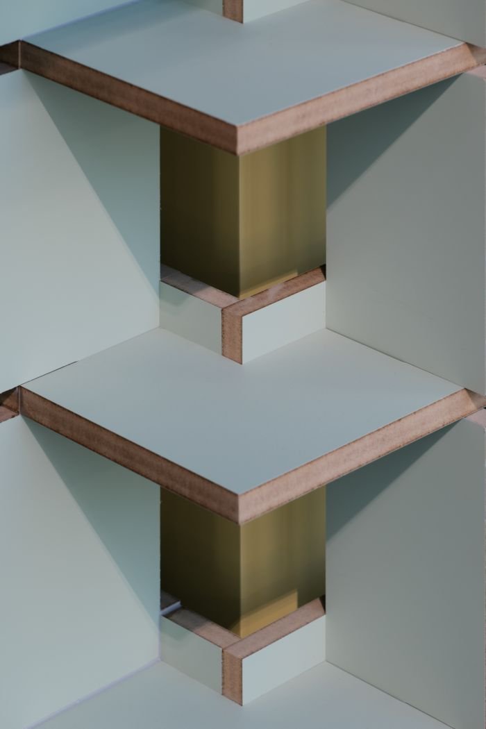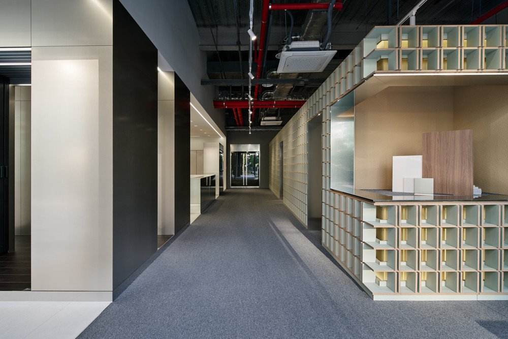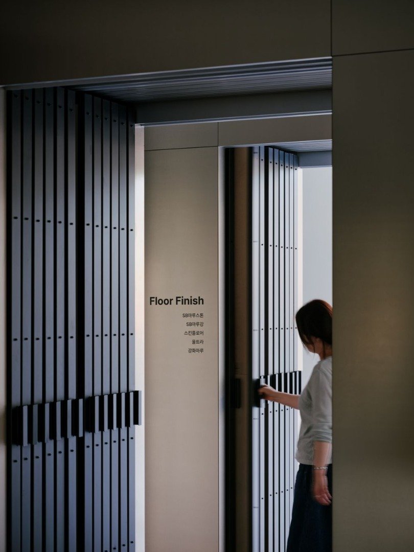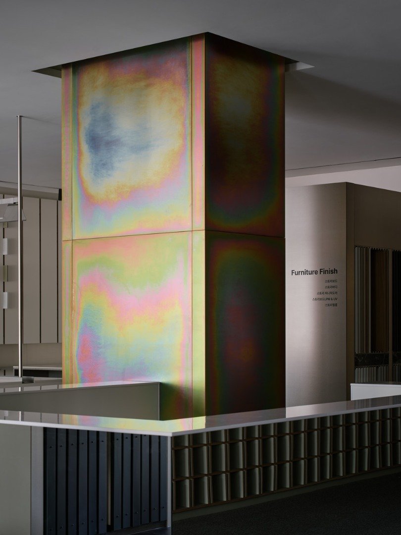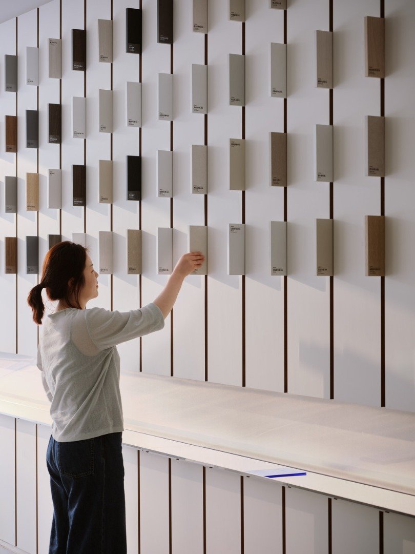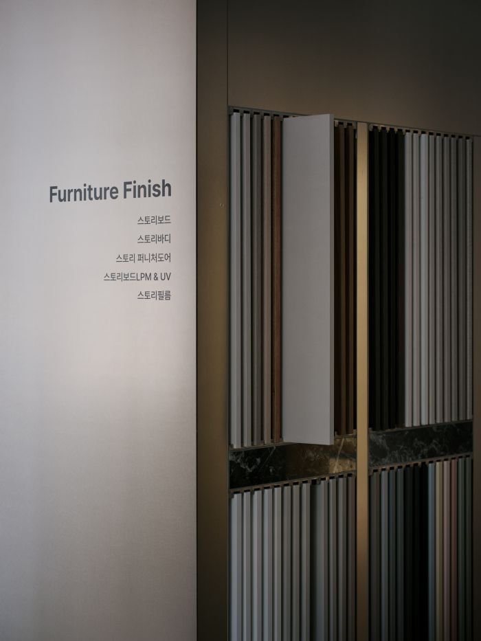 공간은 맥락 안에서 어우러지지만 브랜드의 첫 번째 오프라인 공간이라는 상황에서 본다면 시각적으로 각인 될수 있는 디자인 언어가 보여져야 함이 중요한 부분인데 이것을 표현하는데 있어서 “한솔홈데코”의 제품이 그 역할을 하는 것이 의미를 갖을 수 있다고 생각했습니다. 그래서 MDF가 가지는 근본적인 구조와 특징을 드러내고, 제품의 생산 형태인 판재가 가지는 구조적 미감을 통해 보여주고자 하였습니다. 이는 주거 공간 시장에 국한되어 활용되었던 “한솔홈데코”의 제품이 살짝 관점을 달리하면 다양한 공간에서 쓰일 수 있음을 보여주고자 하는 의지도 내포되어 있습니다.
