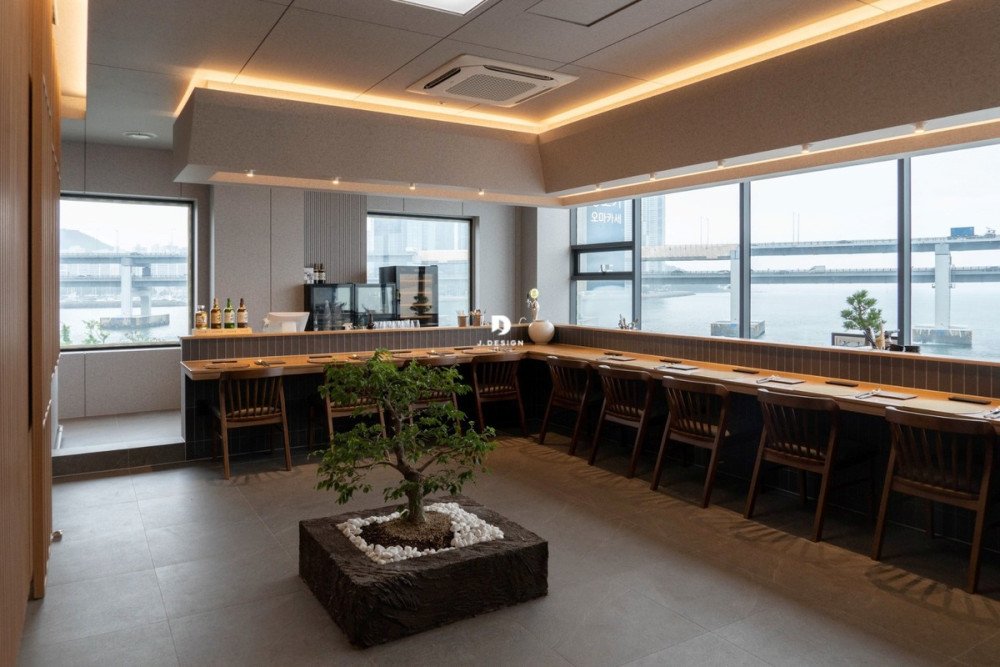 프리미엄 양고기 오마카세 인테리어로 업종의 아이덴티티를 살려 고급스럽게 완성한 부산인테리어 다찌형 테이블을 설치해 요리하는 셰프와 방문객들이 동선 구애 받지않고 음식에 집중할 수 있도록 했습니다.