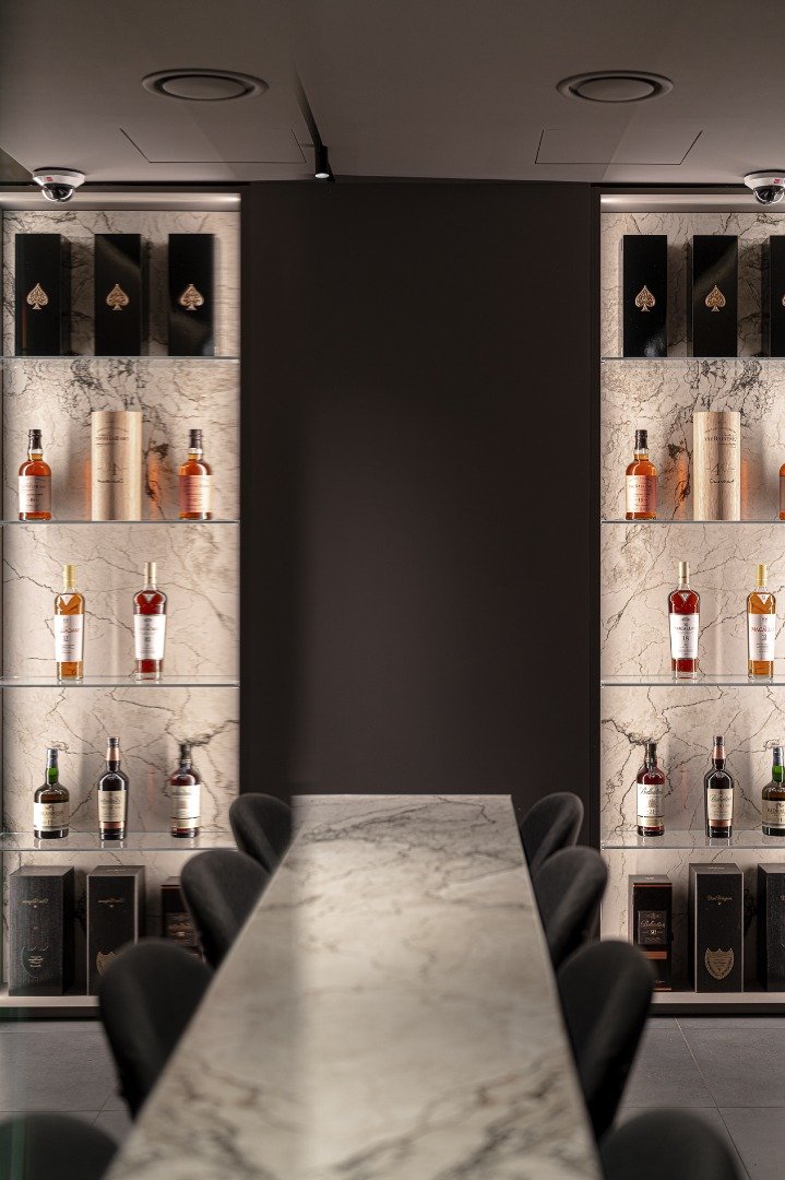 Construction Finished, 2023 위치 : 서울시 강남구 청담동 용도 : 일반음식점 면적 : 115㎡ (35py) 팀원 : 최빈, 최한중 사진 : 제리그래퍼 동영상 : https://youtu.be/b1RkUvvYCN8?si=KkjtGWQTwX5KUJQz 사람과 사람, 사람과 사물 사이에는 보이지 않는 교감들이 존재한다. 청담 여백은 계절에 따른 음식뿐만 아니라 사람들 사이의 다양한 문화와 이야기, 작품들을 담을 수 있는 공간으로, 여백의 공간이 채워지며 서로 연결되고자 하는 바람이 담겨 있다. 먼저, 입구에 들어서면 카운터석이 바로 보이지 않도록 떠있는 갤러리 벽을 거치도록 했다. 벽을 경계로 바깥쪽 그레이톤의 갤러리 복도와 대비되도록 안쪽에는 밝은 홀을 두어 셰프가 요리하는 모습과 음식을 무대 위 공연과 작품처럼 느껴지도록 연출했다. 셰프와 작품이 부각될 수 있도록 아트월을 비우고 화로의 전면이 고객쪽을 바라보도록 위치시켰다. 또한 주방으로 이어지는 동선은 자연스럽게 아트월 뒤로 숨겨서 여백의 컨셉을 이어 나갔다. 가벽 뒤로 숨겨진 프라이빗룸은 예약 고객만 경험할 수 있는 아지트공간으로 히든도어를 사용하여 더욱 내밀한 느낌을 주었다. 어두운 바탕에 대리석상판과 장식장을 조명으로 강조하고, 좁고 나지막한 공간에 거울기둥을 두어 확장과 착시효과를 적극 활용하였다.