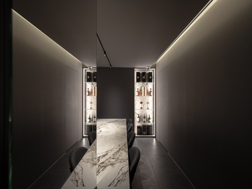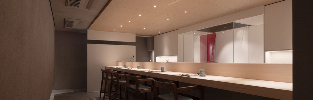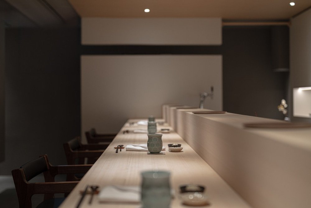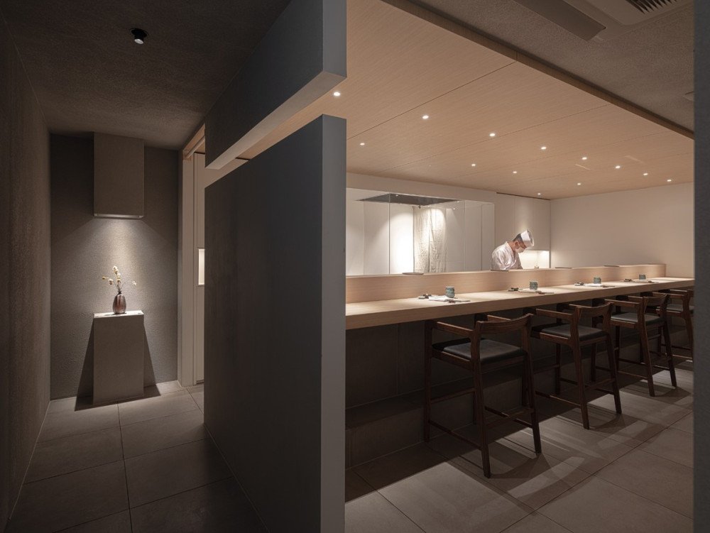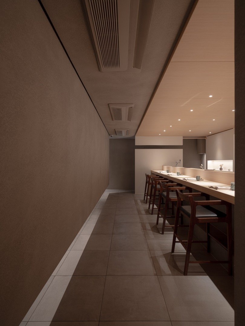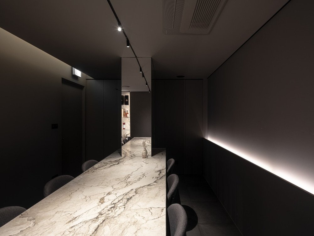 There are invisible exchanges that exist between people, and between people and objects. Yeo Baek is a space designed to embrace not only seasonal cuisine but also the diverse cultures, stories, and artworks shared among people. It embodies the hope that, as the empty space becomes filled, new connections are formed. Upon entering, visitors are first greeted by a floating gallery wall that conceals the counter area from direct view. The wall acts as a soft boundary: the outer corridor, finished in subtle gray tones, contrasts with the inner hall, which is bright and open. This creates a stage-like setting where the chef’s movements and dishes can be appreciated as both performance and art. To emphasize the chef and his creations, the art wall is intentionally left bare, while the hearth faces the guests directly, forming the visual centerpiece of the space. The circulation leading to the kitchen is discreetly hidden behind the art wall, continuing the concept of Yeo Baek — the beauty of emptiness and restraint. Behind a partition lies a private dining room, accessible only to reserved guests, its entrance concealed by a hidden door to evoke intimacy and exclusivity. The dark-toned interior is accented with a marble countertop and softly lit display shelves, while mirrored columns are used to amplify the sense of depth and spatial illusion within the low, narrow space. |